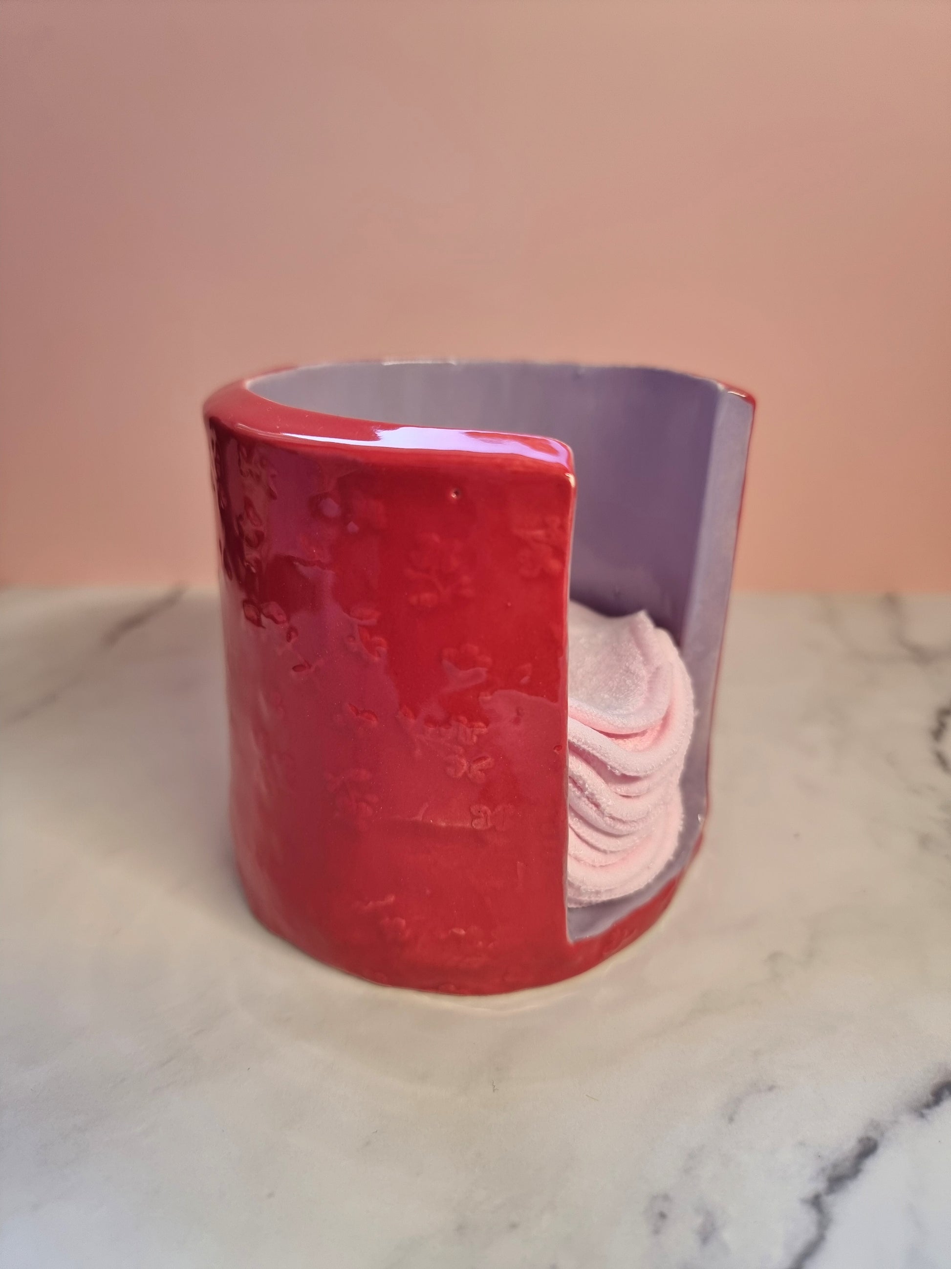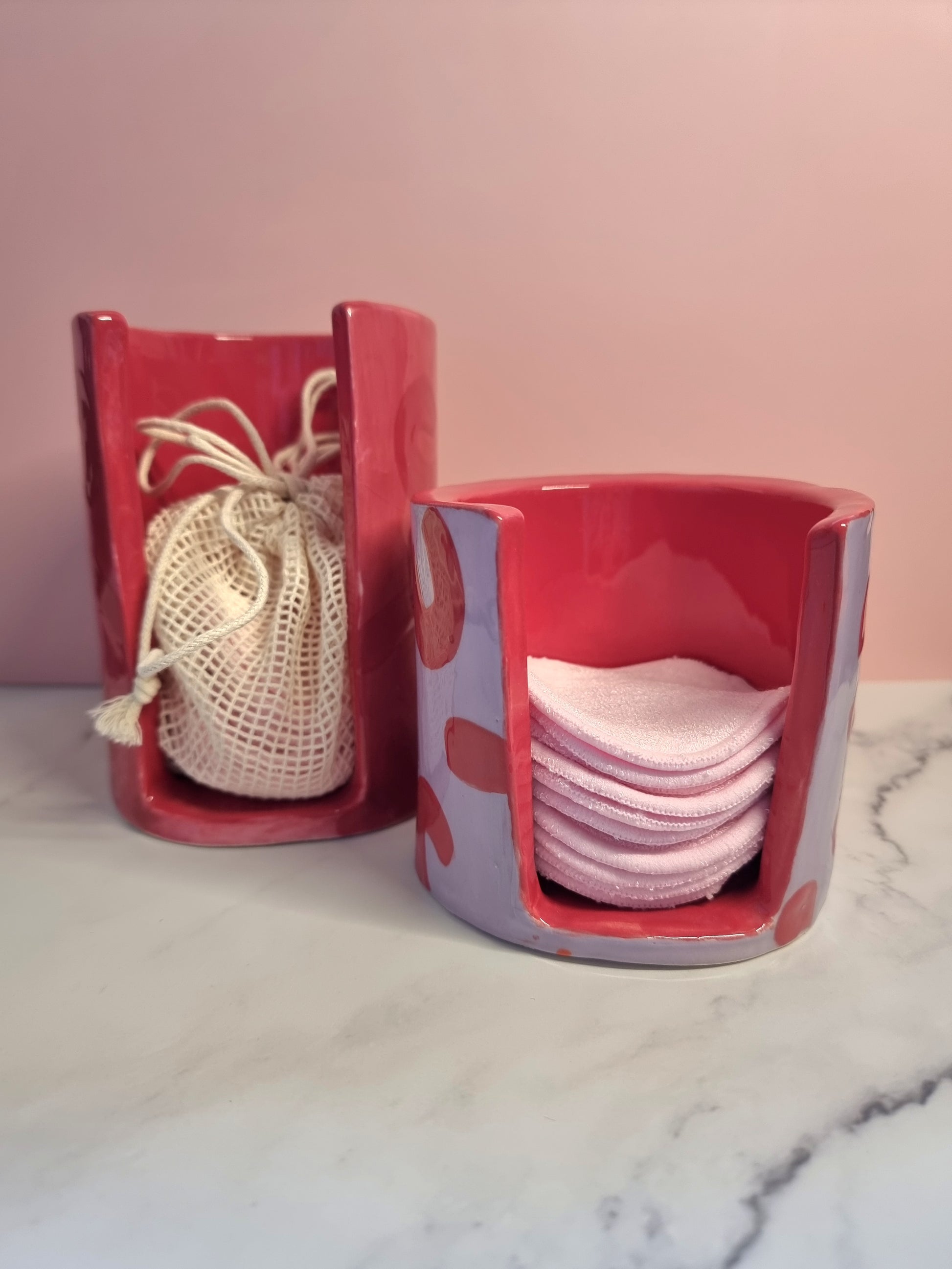 Ceramic makeup wipe holder. Includes pack of reusable face pads.