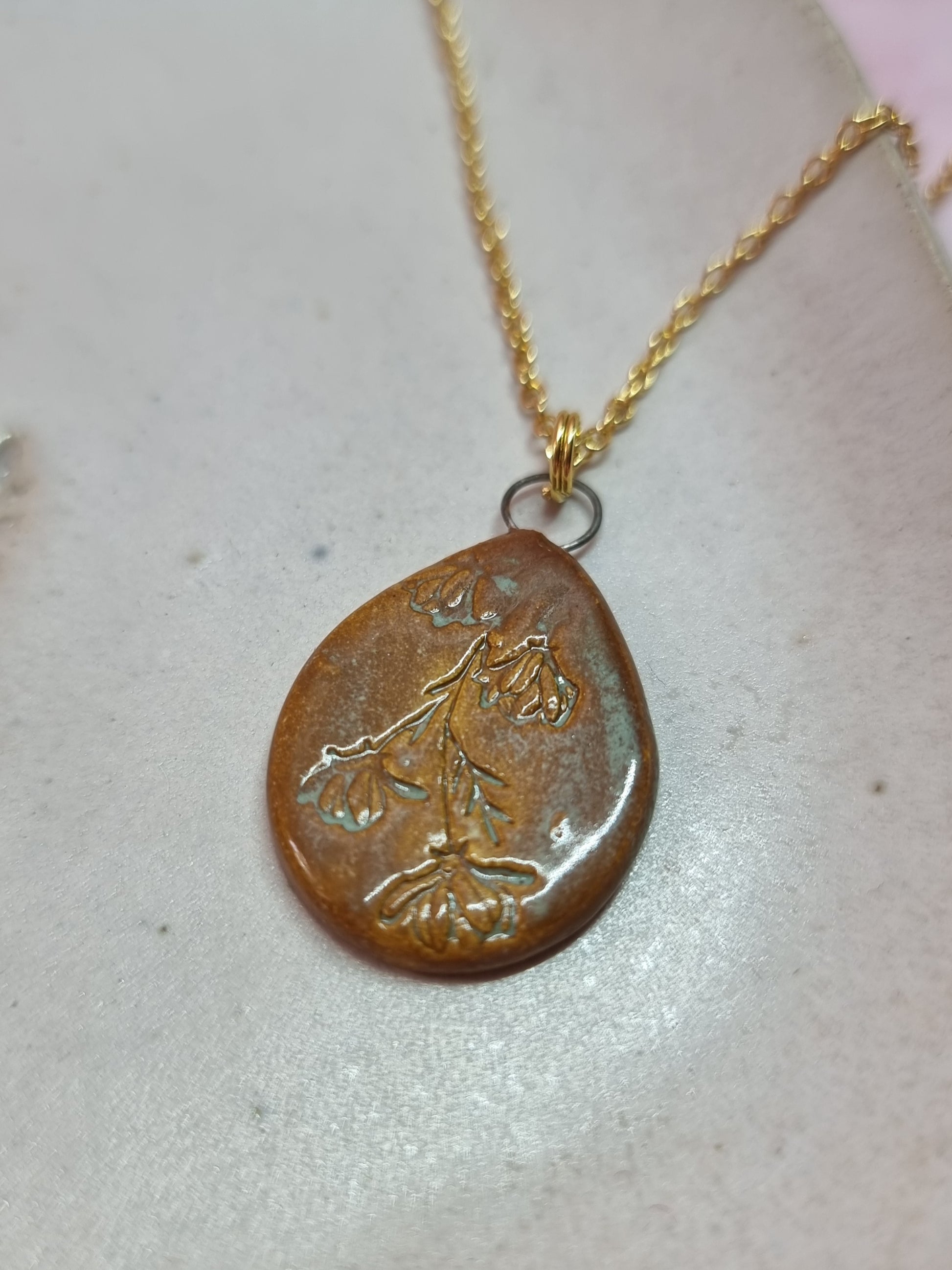 Ceramic teardrop shaped pendant with inset wildflowers set on stainless steel chain.